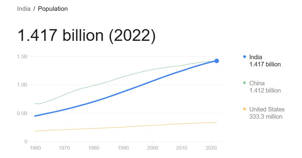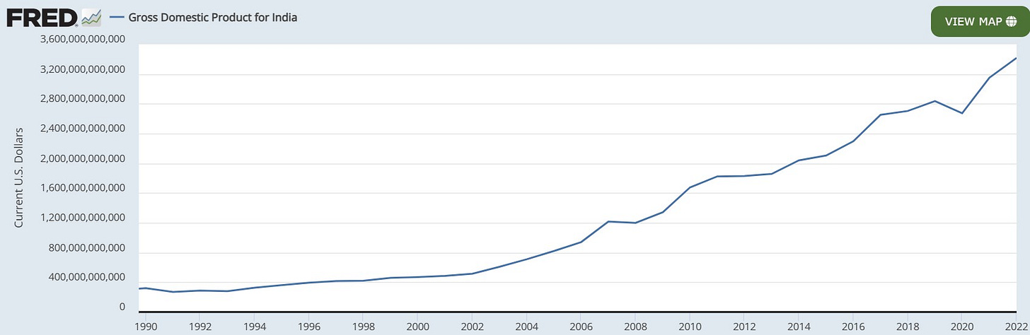 As you can see from the chart, since 1990 through the end of 2022, India has gone from about $320.9 billion in GDP to about $3.417 trillion in GDP. This represents an average compounded annual growth rate of about 7.67% over those 32 years.
